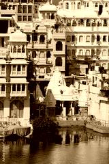View of historic buildings and colorful homes in heritage city Udaipur in Rajasthan, India.