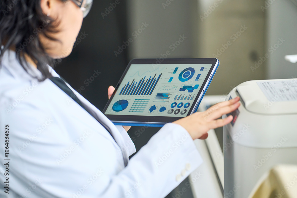 tablet, engineer, experiment, science, data, dx, digital transformation, research, development, woman, business, equipment, medical, graph, chart, screen, terminal, operation, electronics, ai, analysi