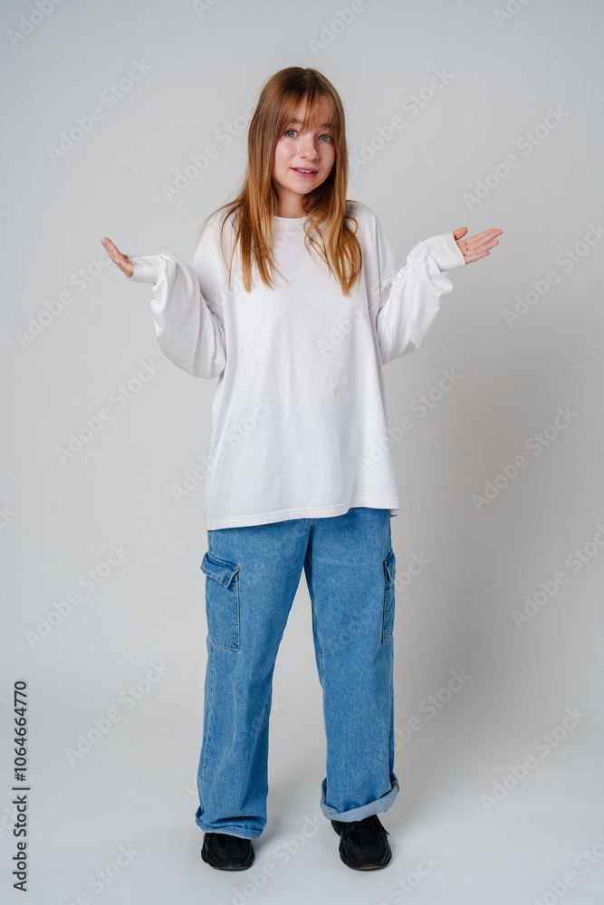 A young girl wearing a white long-sleeve shirt expressing confusion in a minimalistic gray studio setting