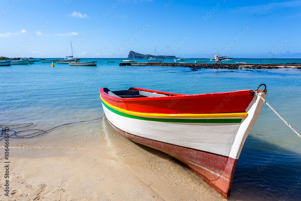 Barque aux couleurs rasta sur plage de Cap Malheureux, île Maurice