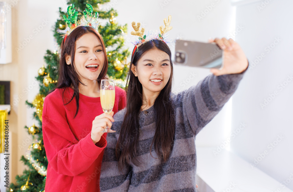 Two happy beautiful Asian women cute best friend female smiling selfie photo with smart mobile phone enjoy party near decorating Christmas tree funny Christmas Eve Happy New Year celebration holiday.