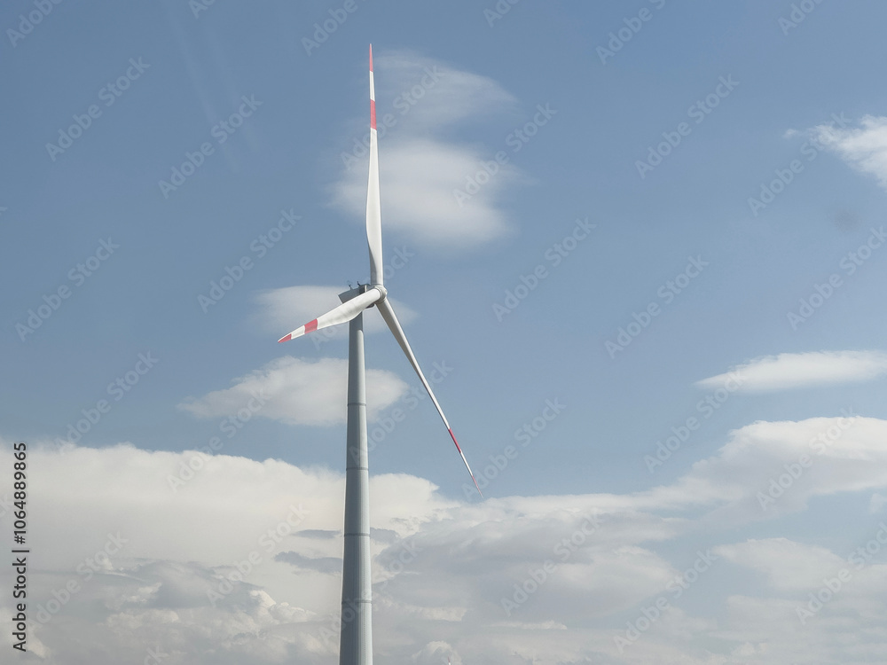 The windmill rotates gracefully in the breeze, showcasing its blades against a backdrop of blue sky and white clouds, symbolizing sustainable energy innovation