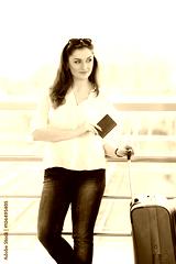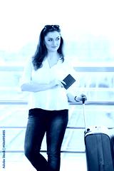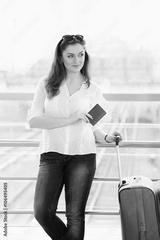 woman in a white blouse standing with a suitcase, holding a passport in the background of glass wall at the station
