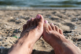 A womans bare feet are completely covered in fine sand at the beach