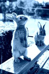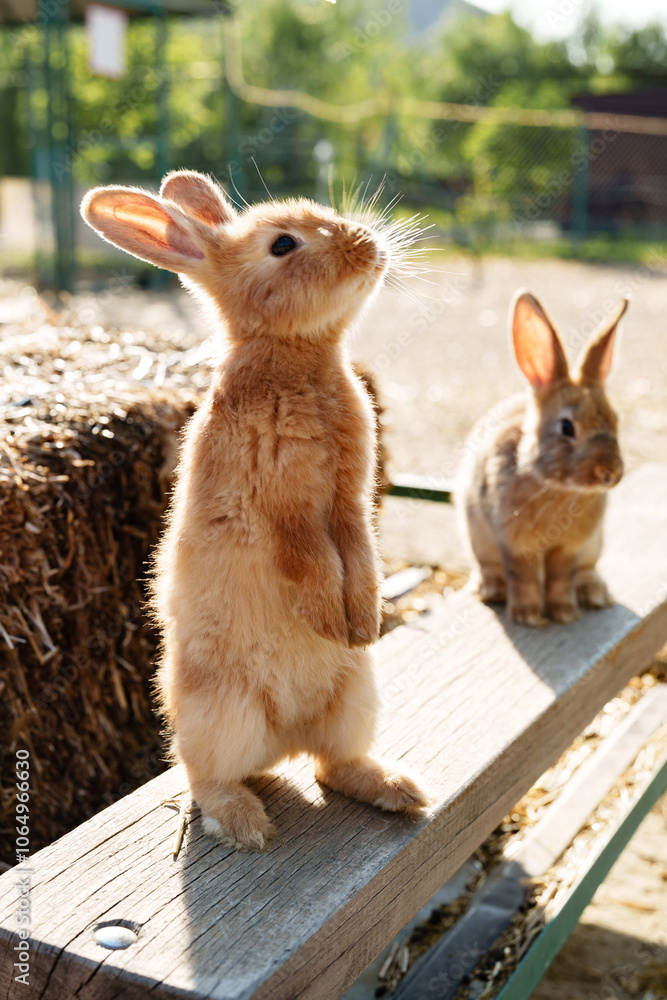A small brown rabbit curiously explores a wooden bench near hay bales in a sunny farm