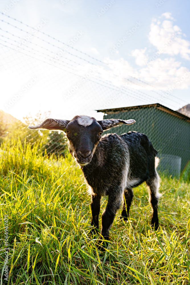 A friendly goat exploring a grassy field under a clear sky in a serene countryside