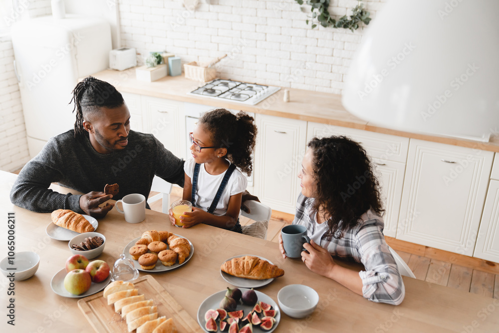 Top view image of African-american family, parents and daughter having morning breakfast at home kitchen, talking and spending time together. Family bonding