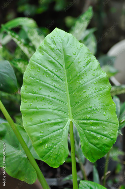 Alocasia, Alocasia macrorrhizos or Alocasia plant pr leaf background and rain droplet