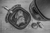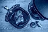 Two grilled steaks from air fryer oven on a wooden background, easy crispy food with little or no fat by circulating hot air inside the basket