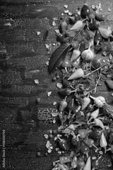 top view of garlic, dry and colorful peppers, sea salt, differen