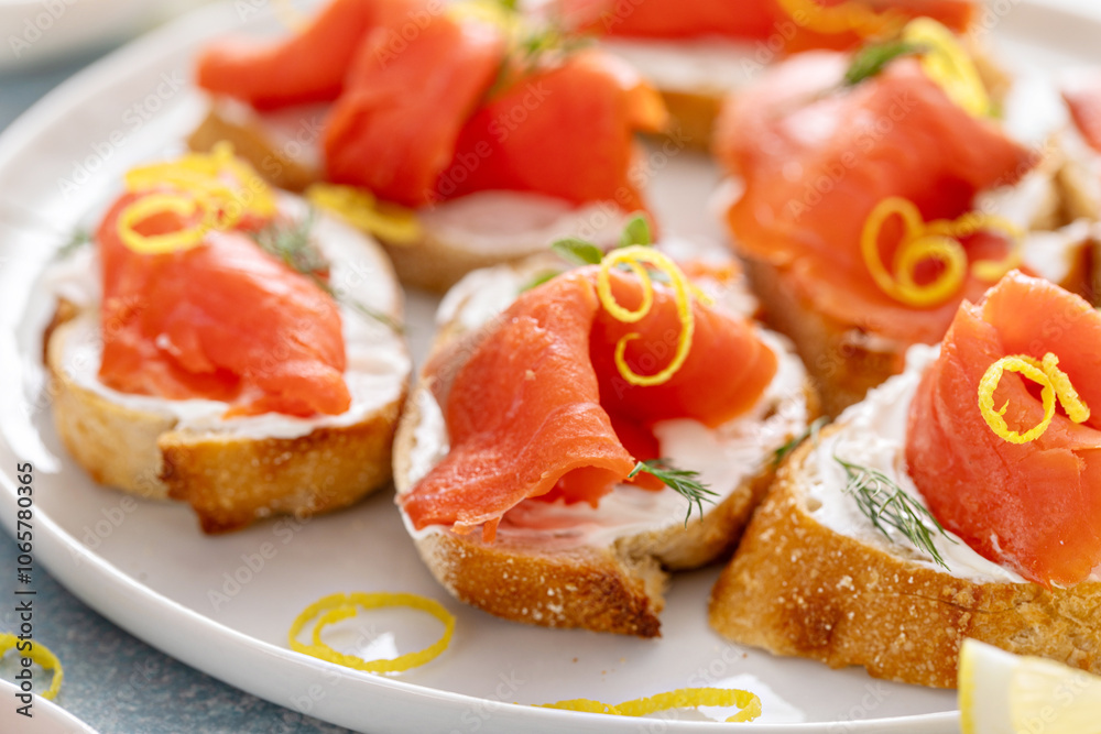Smoked salmon crostini or bruschetta with cream cheese and lox