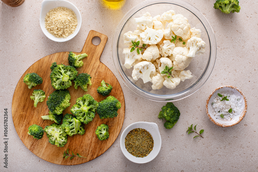 Fresh broccoli and cauliflower, ready to be roasted, cooking with vegetables