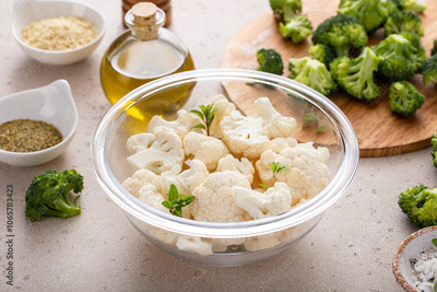 Bowl of cauliflower with broccoli, ready to be roasted, cooking with vegetables