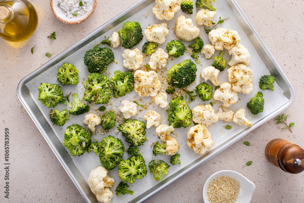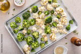 Broccoli and cauliflower ready to be roasted on a baking sheet with herbs