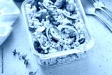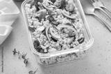 Pearl couscous salad with fresh vegetables and red onion in a meal prep container
