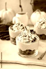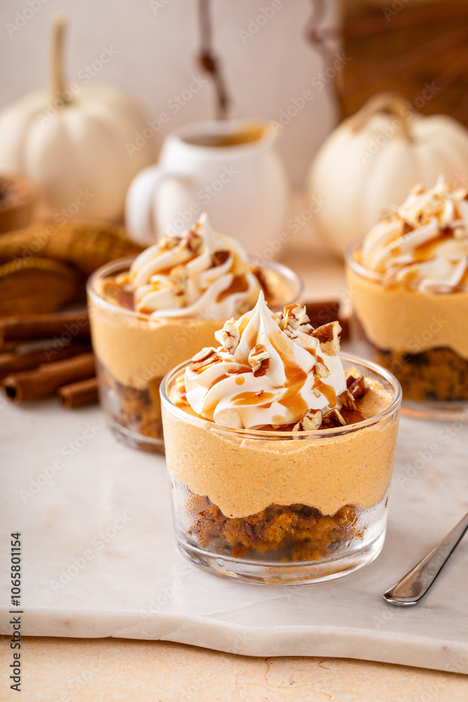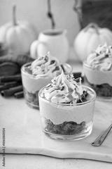 Pumpkin dessert in a cup, pudding or no bake cheesecake with spices and whipped cream