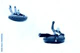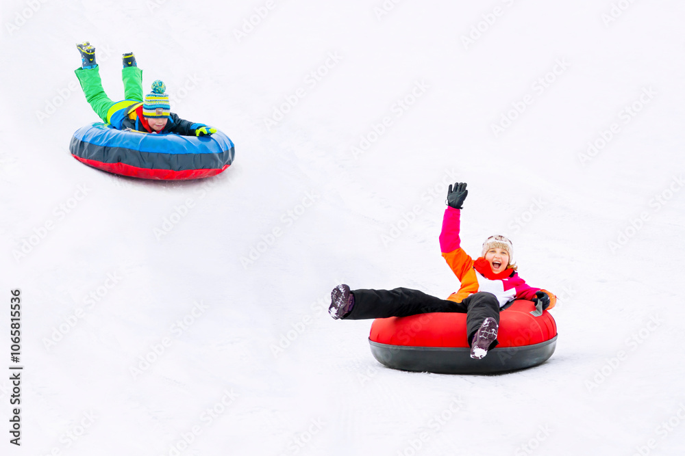 Kids on Snow Tubes Downhill at Winter Day