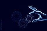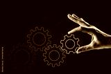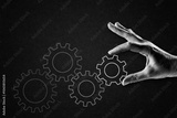 Hand Turning Gear Sign in Black and White on Textured Paper Background, Copy Space