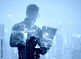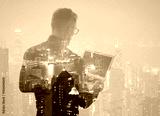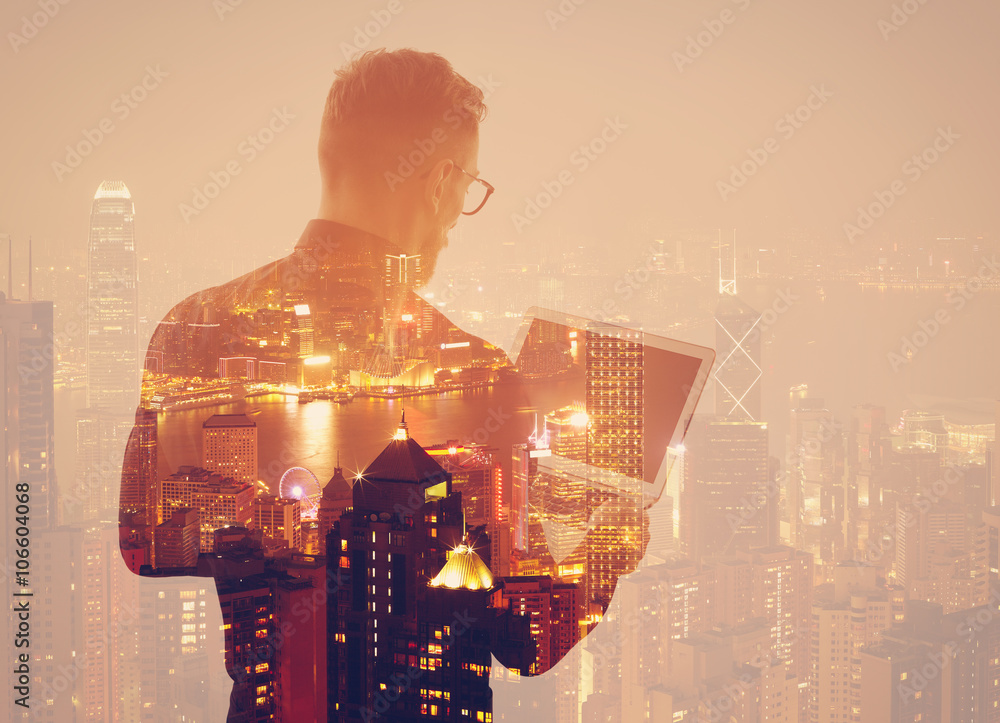 Double exposure young bearded businessman wearing black shirt and holding modern notebook hands. Panoramic view contemporary night city background. Horizontal mockup