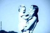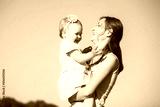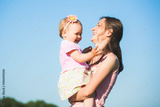 Mum playing with child outside on sunny warm day. Portrait of happy laughing woman and little girl at blue sky background. Mom holding baby in hands and laughing. People and positive emotions.