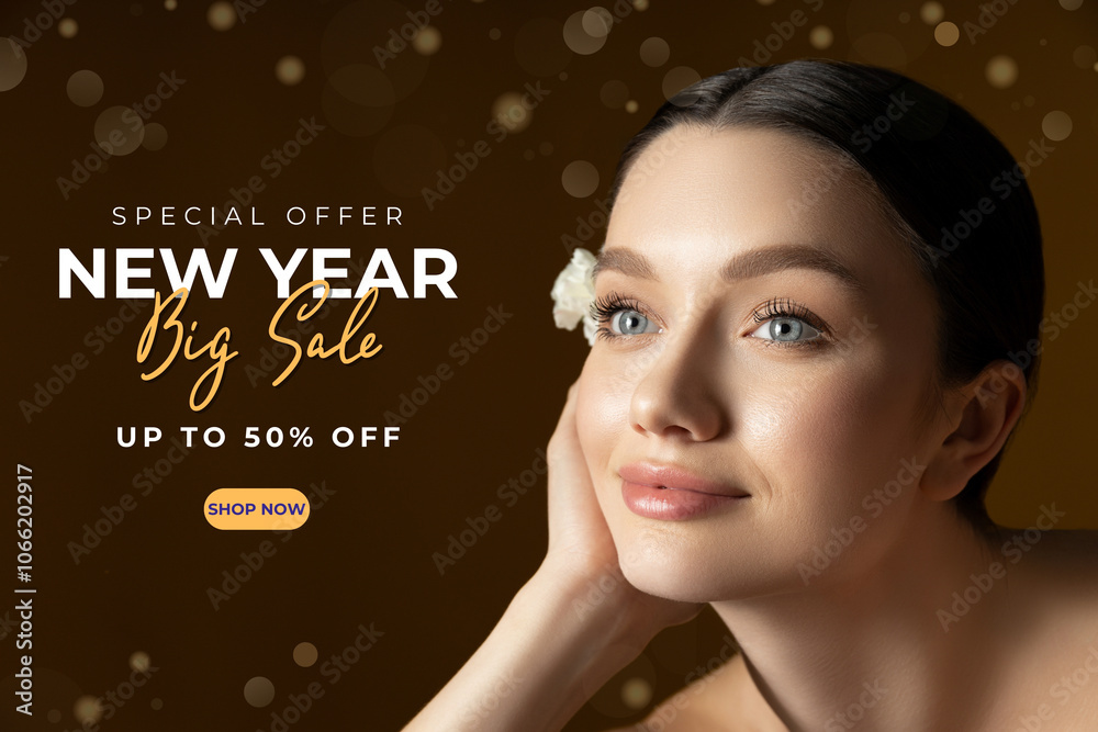 Design for big discounts for the new year, with a beautiful girl.