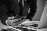 Businessman using a smartphone in an office setting, representing digital finance and communication. Suitable for fintech services, mobile banking apps