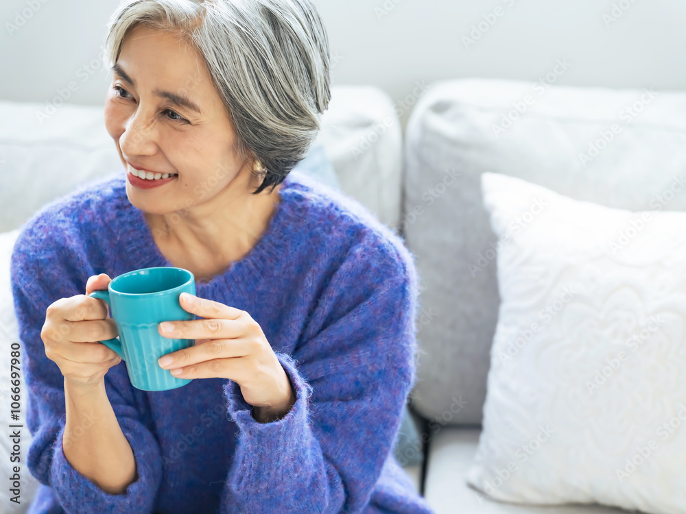 シニア, 女性, 日本人, リラックス, 笑顔, 老後, セカンドライフ, 高齢者, お年寄り, 楽しい, 幸せ, 嬉しい, 白髪, グレイヘア, ソファー, リビングルーム, インテリア, 暮らし, ライフスタイル, ハッピー, ウェルネス, 健康, ヘルスケア, 明るい, 充実, 人生, 終活, 年金, 生活, テレビ, ドラマ, コピースペース, アンチエイジング, エイジングケア, 美容,