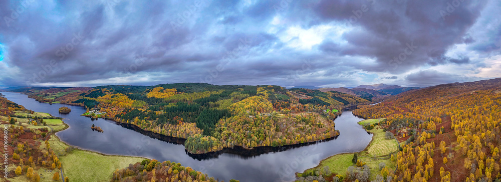 Loch Tummel, Perthshire, Scotland. Landscape panoramic drone photography