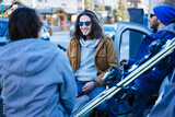 Young friends arrived at winter vacation village with skies and snowboard - Happy skiers having fun unloading the car - Extreme sport, travel holidays and friendship concept - Focus on center man face