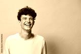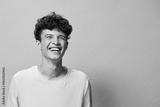 Young man smiling with curly hair, light shirt, cheerful expression against a warm beige background, conveying happiness and positivity in a casual setting