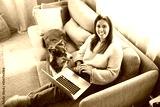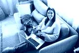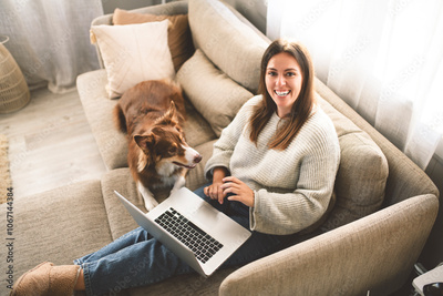 woman with cute fluffy Australian Shepherd dog at home using laptop computer in living room