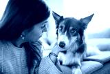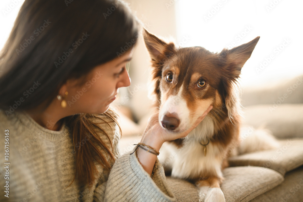 woman with cute fluffy Australian Shepherd dog at home in living room