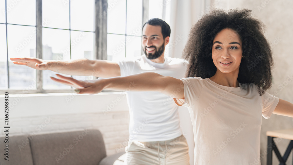 Close up of fit mixed race family couple doing fitness yoga morning exercise at home. Sporty healthy Arabian man and African woman training together standing in living room.