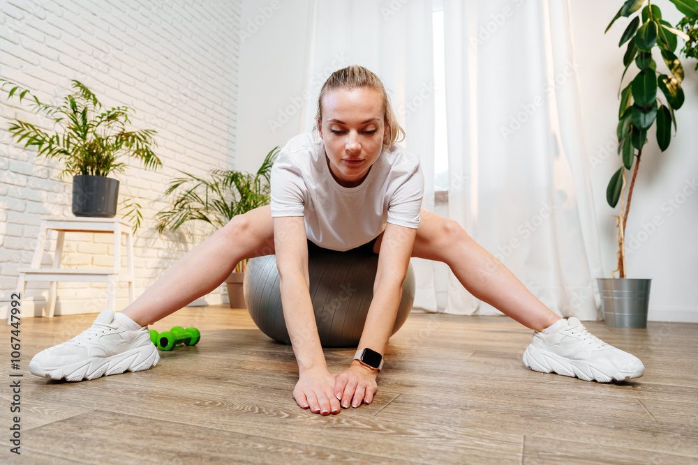 Young woman stretching on a fitness ball in a bright modern room