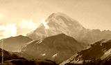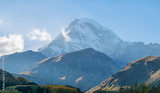 Panoramic landscape view, autumn in caucasus mountains, snow covered mountain peak in sunny day, Georgia
