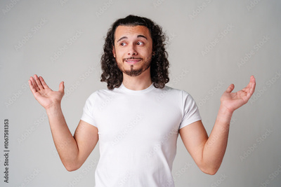 A man with curly hair expressing uncertainty while standing against a neutral background