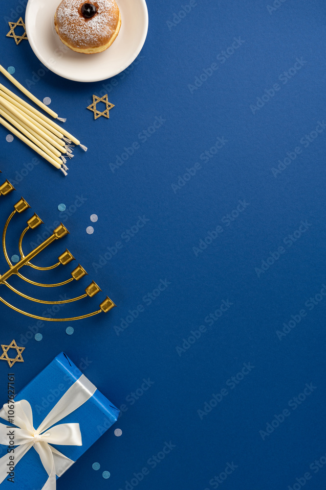 A beautiful Hanukkah vertical arrangement featuring a menorah, candlesticks, a powdered doughnut, and a gift box on a blue surface, creating a festive celebration atmosphere