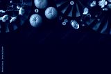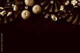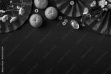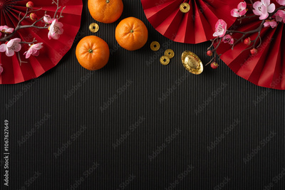 Chinese New Year decorations with red fans, tangerines, and gold ingot on a dark background symbolizing prosperity and festivity