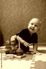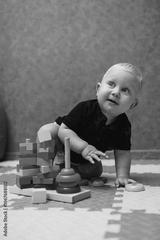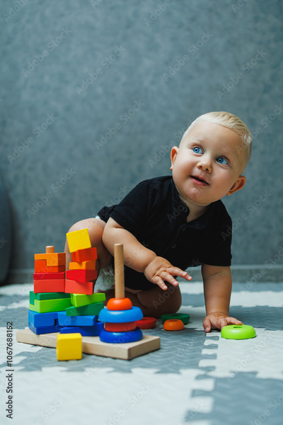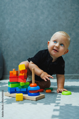 A toddler boy sits on a rug and plays with a wooden pyramid. Development of the baby. Toys for babies