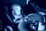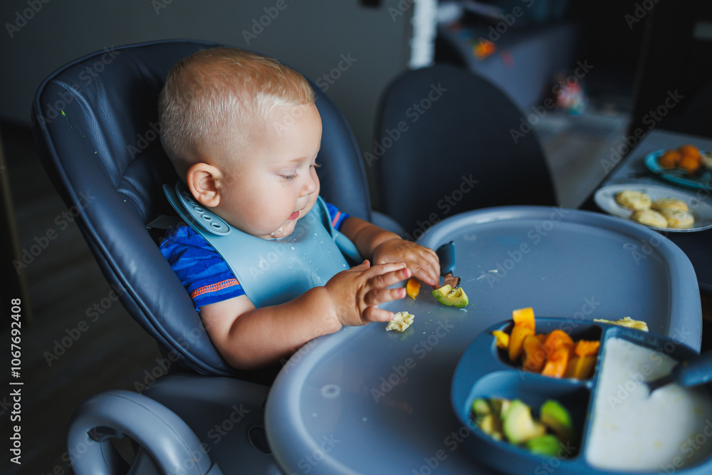A little boy learns to eat with a fork. Baby food. The child learns to eat independently.