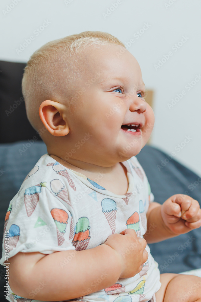 Cute little boy playing at home and laughing. cheerful kid laughs. An emotional child