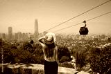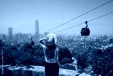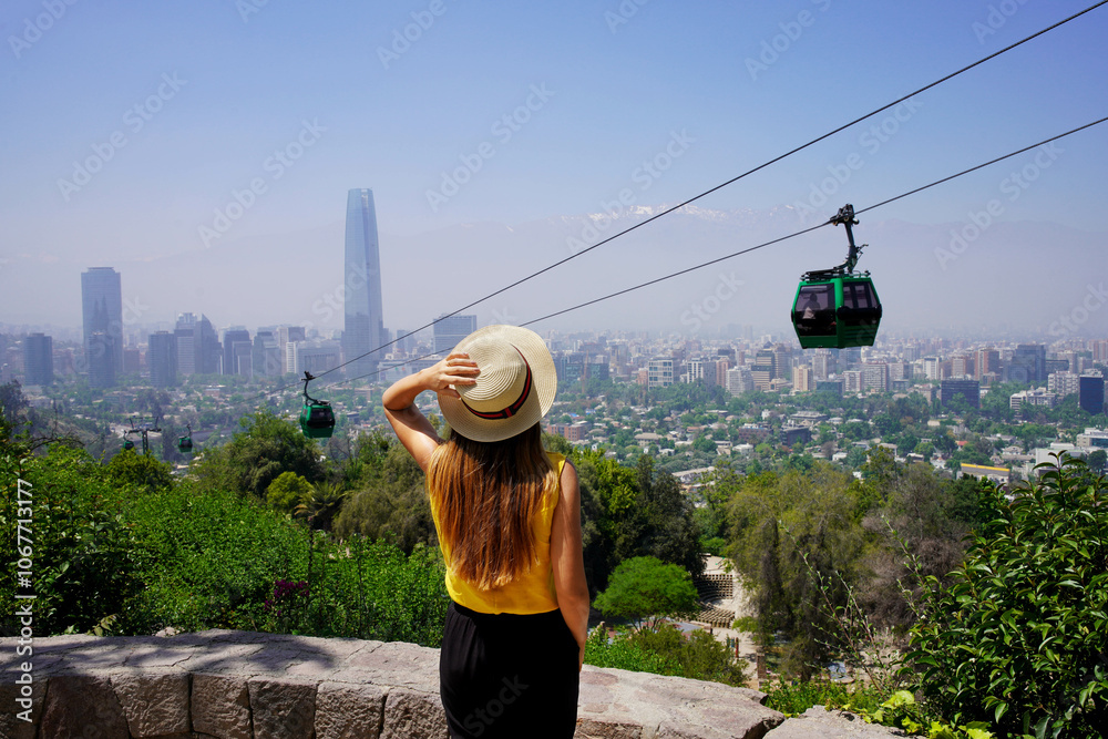 Tourism in Santiago de Chile. Back view of traveler woman looking at cable cars in Santiago Metropolitan Park, Chile.