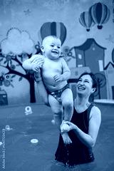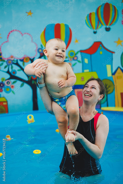 A child learns to swim in a pool with a coach. Teaching children to swim.