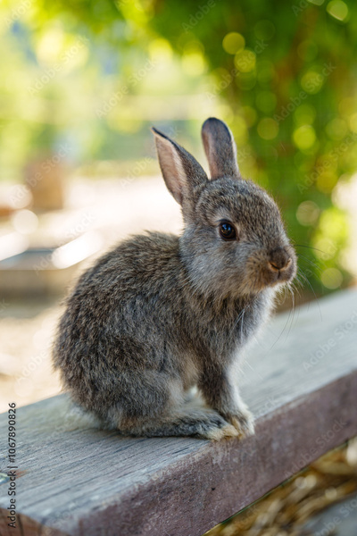 A small brown rabbit curiously explores a wooden bench near hay bales in a sunny farm
