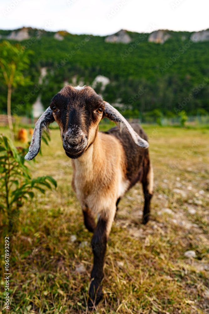 A friendly goat exploring a grassy field under a clear sky in a serene countryside
