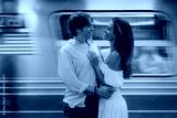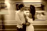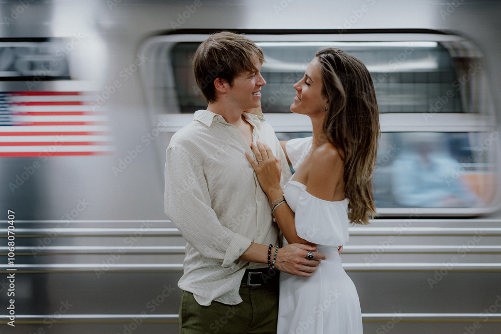 A couple shares a tender moment in a busy subway in New York, showcasing their love amidst the citys constant energy