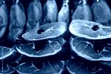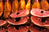 Iberico cured jamon on the market stall in Valencia Mercado