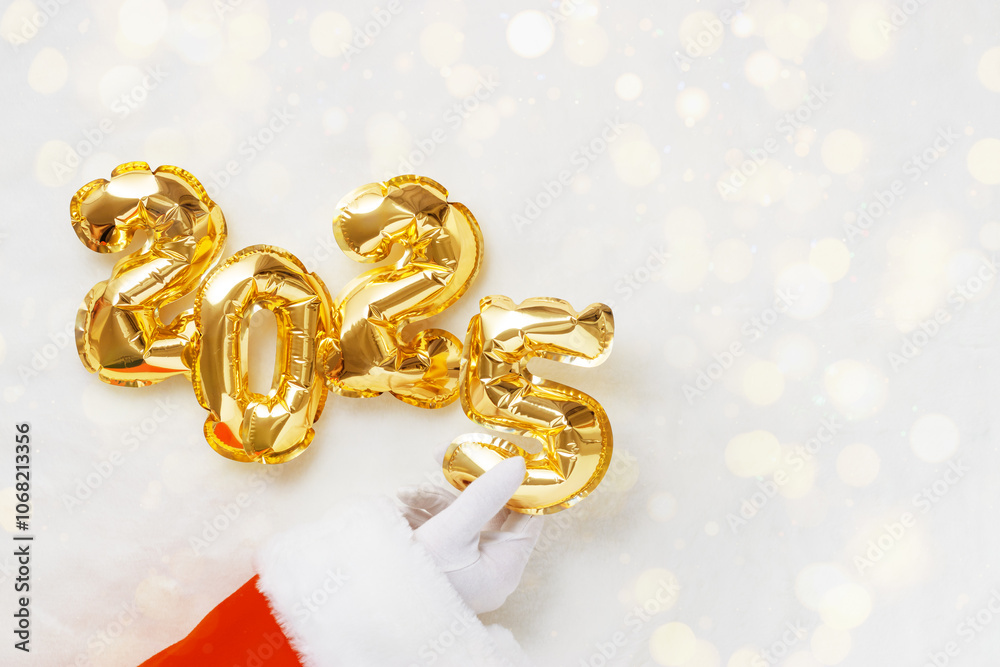Santa hand holding Golden foil balloons shaped as 2025 on white soft glowing background and golden bokeh, Christmas and New Year Eve celebrate concept Top view Festive Christmas winter holidays