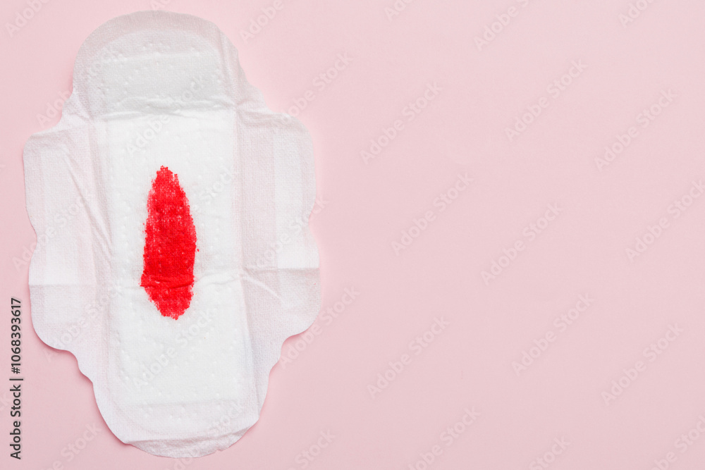 Women hygiene products or Sanitary pad with red feather on colored background. Pastel color. Closeup. Empty place for text. Female daily hygiene