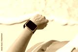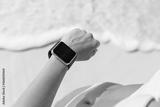 Active lifestyle woman looking at wearable tech smartwatch. Closeup of arm on beach with touch screen on wrist band of person relaxing in the water with activity tracker wrist band in outdoor living.